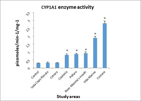The enzymatic response seen in the Crotone (2.81 pmoles/min-1/mg-1) and Vibo Marina (1.89 pmoles/min-1/mg-1) areas could be correlated with the concentration of 2,4 DDE (5.776 ng/g and 2.027 ng/g respectively), belonging to the halogenated hydrocarbons, of which the inductive effect on CYP1A1 activity is well known.89