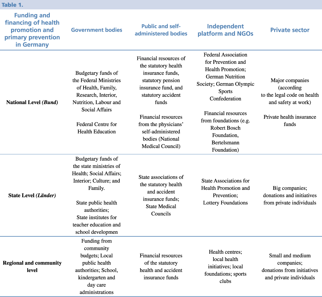 Prevention, therefore, is modelled on the political structure of the country and based on the Bismarckian corporate welfare state. It is included in public health services that recognise authorities at national, state and municipal level. The legislative responsibility for most policy areas is divided between national and federal authorities. Key players are government organisations, self-administered bodies and non-government organisations, which are part of an effective network that shares responsibilities and duties. Accordingly, policies, health promotion and primary prevention implementation measures are introduced and developed at different levels and in two areas – within government organisations, non-government organisations and self-administered bodies.