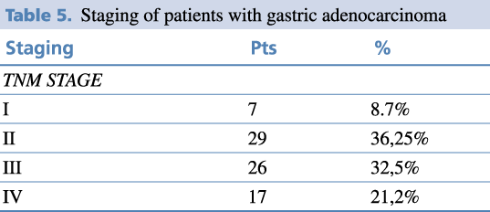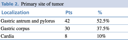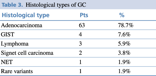 Gastric adenocarcinoma, the most frequent histological type was diagnosed in 63 patients, whereas nonadenocarcinoma primary gastric tumors were detected in 11 patients in total as presented in Table 3.