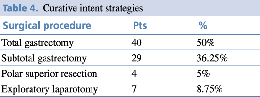Of these patients, 91.3% were treated with curative intent, as shown in Table 4, while 8.7 % underwent palliative surgery as they were not considered candidable for surgery.
