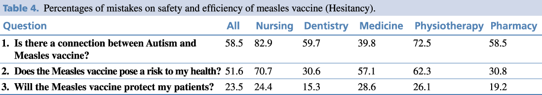 Table 4. Percentages of mistakes on safety and efficiency of measles vaccine (Hesitancy).