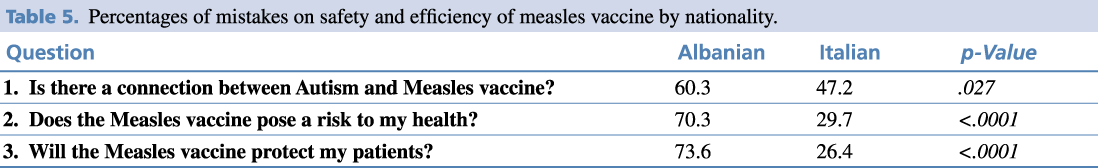No significant differences in relation to gender were found. Albanian students showed less trust in safety and efficiency of the measles vaccine (Table 5).
