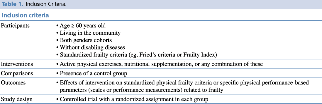 The primary outcome of this review was to investigate the potential reversibility power of a physical or combined physical and nutritional intervention program on frailty status.