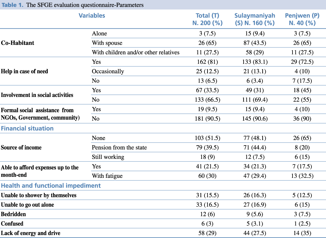 Table 1 presents some variables included in the SFGE, with results presented as a total then split by area of provenience. In the co-habitant item, 56.5% (n. 113) of older persons were living with a spouse (43.5% in Sulaymaniyah vs. 65% in Penjwen). Most of the older adult population received informal help when needed (83.1% vs. 72.5%) in the urban and rural areas respectively. Most of the older adult population (66.5%, n. 133) did not take part in any social activity (69.4% Sulaymaniyah vs. 55% Penjwen). Additionally, most of them (90.5%, n. 181) did not receive any formal social assistance from NGOs, Government, or other parties (90.6% Sulaymaniyah vs. 90% Penjwen).