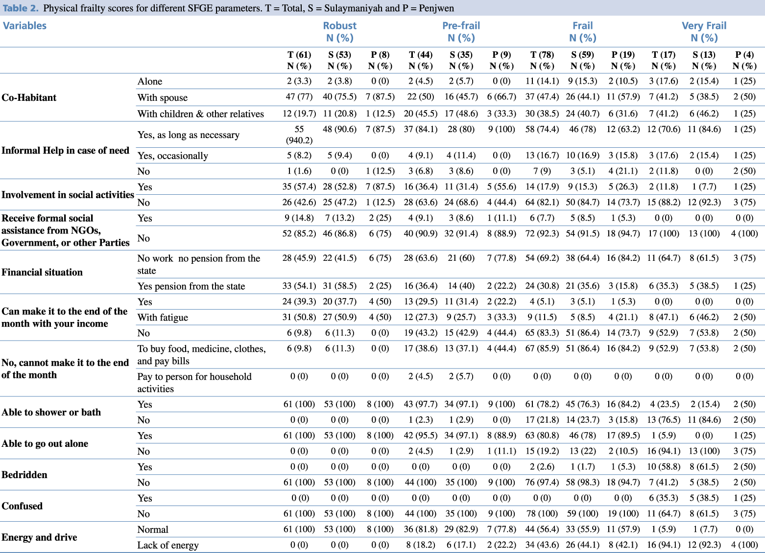 Table 2. Physical frailty scores for different SFGE parameters. T = Total, S = Sulaymaniyah and P = Penjwen.