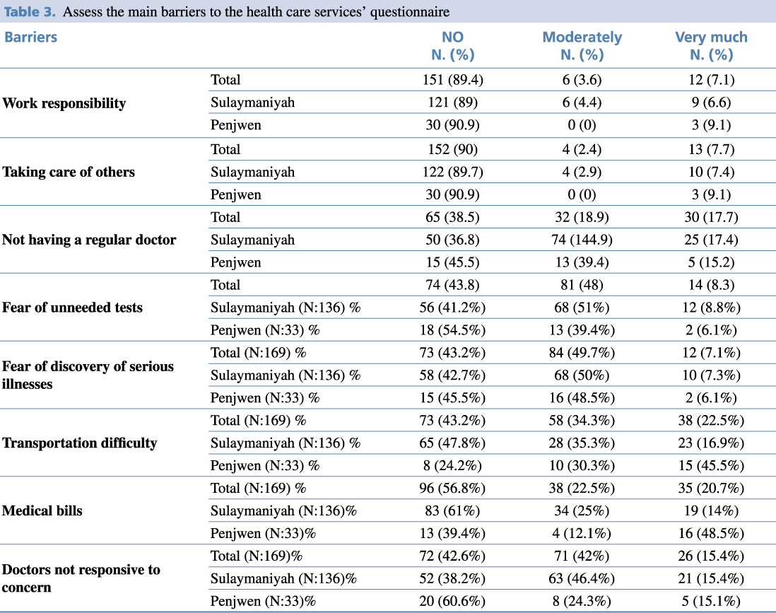 Table 3. Assess the main barriers to the health care services’ questionnaire.