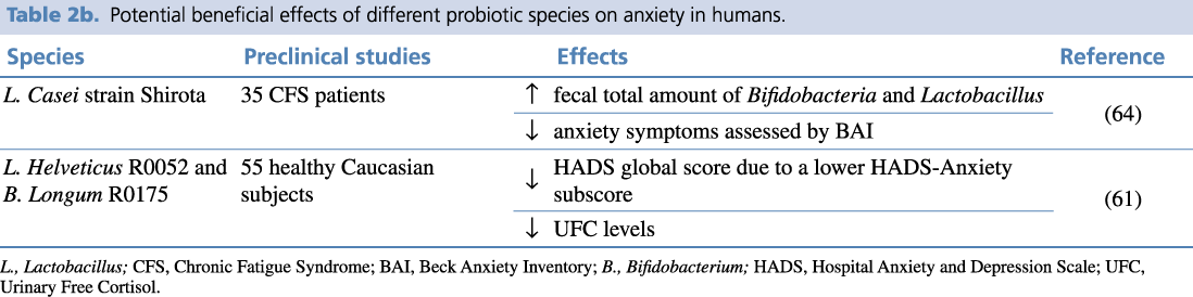 Table 2b. Potential beneficial effects of different probiotic species on anxiety in humans.