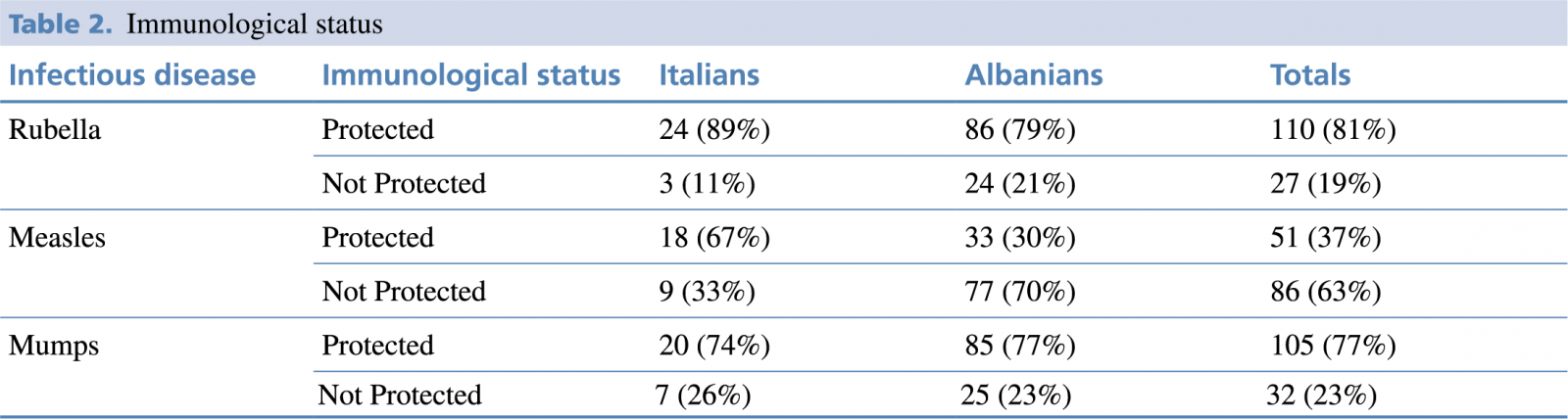 The sample was stratified by nationality to understand the differences between the two nationality groups, based on a different vaccination policy between Italy and Albania. The analysis showed that in the Italian group 24 students out of a total of 27 (89%) were protected against Rubella, while in Albanian group 87 students out of a total of 111 (78%). Therefore, the number of Albanian individuals unprotected for rubella among Albanians was quite high (21%; n.23 individuals). For mumps, the data indicates that the percentage of students with a protective antibody level was almost the same in both the two groups, 74% and 77% respectively. Protection against measles was not satisfactory among the two groups: the protective antibody titer among Albanians was only 29%, which means that the 71% was not immunized. As for Italian students, immunization reached 67%, while 33% resulted unprotected: a significant difference emerged between the two nationality groups (p<0.01).