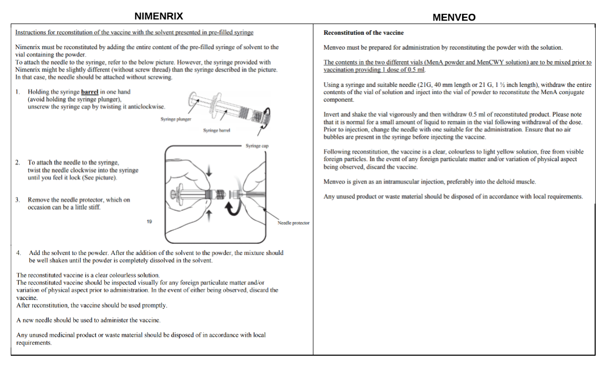 Figure 1. Nimenrix vs Menveo reconstitution. Details are extracted from the leaflets published by the European Medicine Agency website.